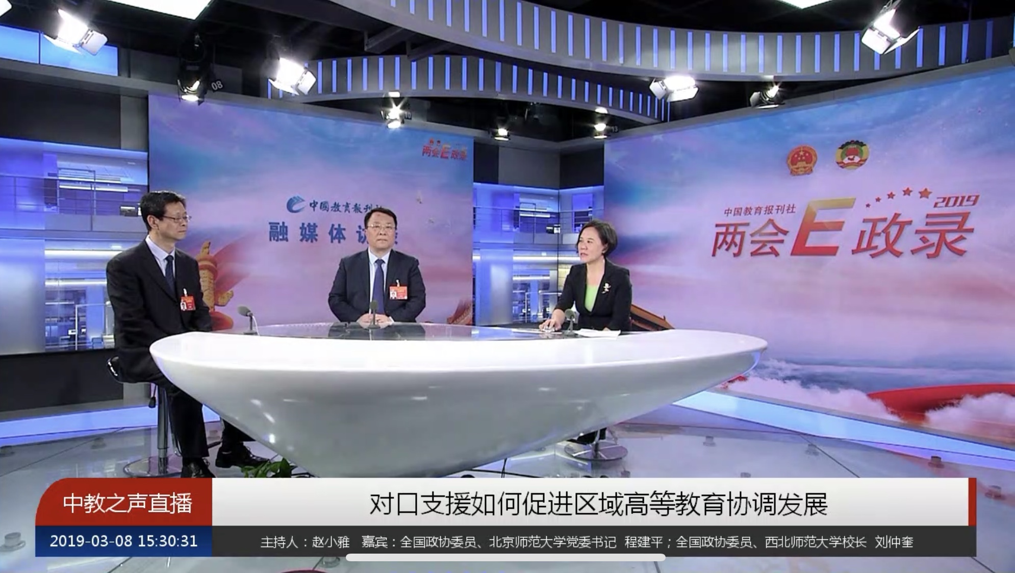 3月8日,全国政协委员、北京师范大学党委书记程建平参加了中国教育报刊社“两会E政录”栏目的访谈,介绍了北师大对口支援工作的开展情况。 他在访谈中提到,按照教育部的部署,北师大承接了对口支援青海师大的光...11 2019-03 -