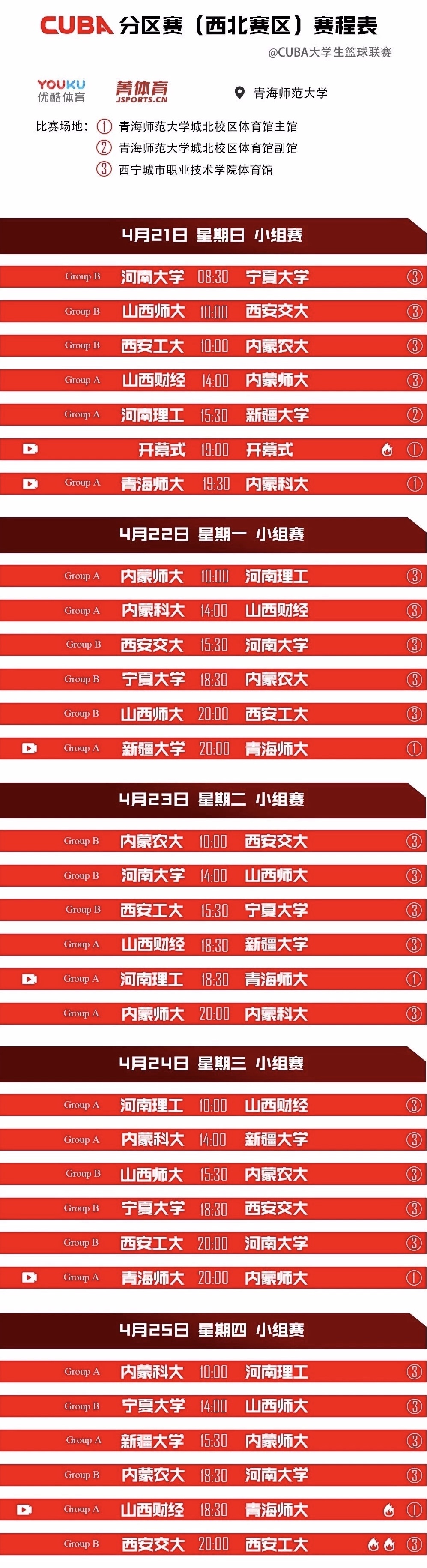 4月21日,由365官网积极承办的第21届中国大学生篮球联赛(CUBA)西北赛区比赛正式开赛。 本次赛事为期9天,分别在1号场地(青海师大城北校区体育馆主馆)、2号场地(青海师大城北校区体育馆副馆)、3号场地(西宁城市职业技...21 2019-04 -