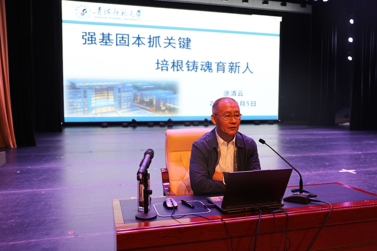 9月5日下午,校党委副书记、校长涂清云在大学生活动中心以“强基固本抓关键、培根铸魂育新人”为主题,为2024级师范生讲授“开学第一课”。物理与电子信息工程学院、化学化工学院、马克思主义学院等9个学院的1200...07 2024-09 -