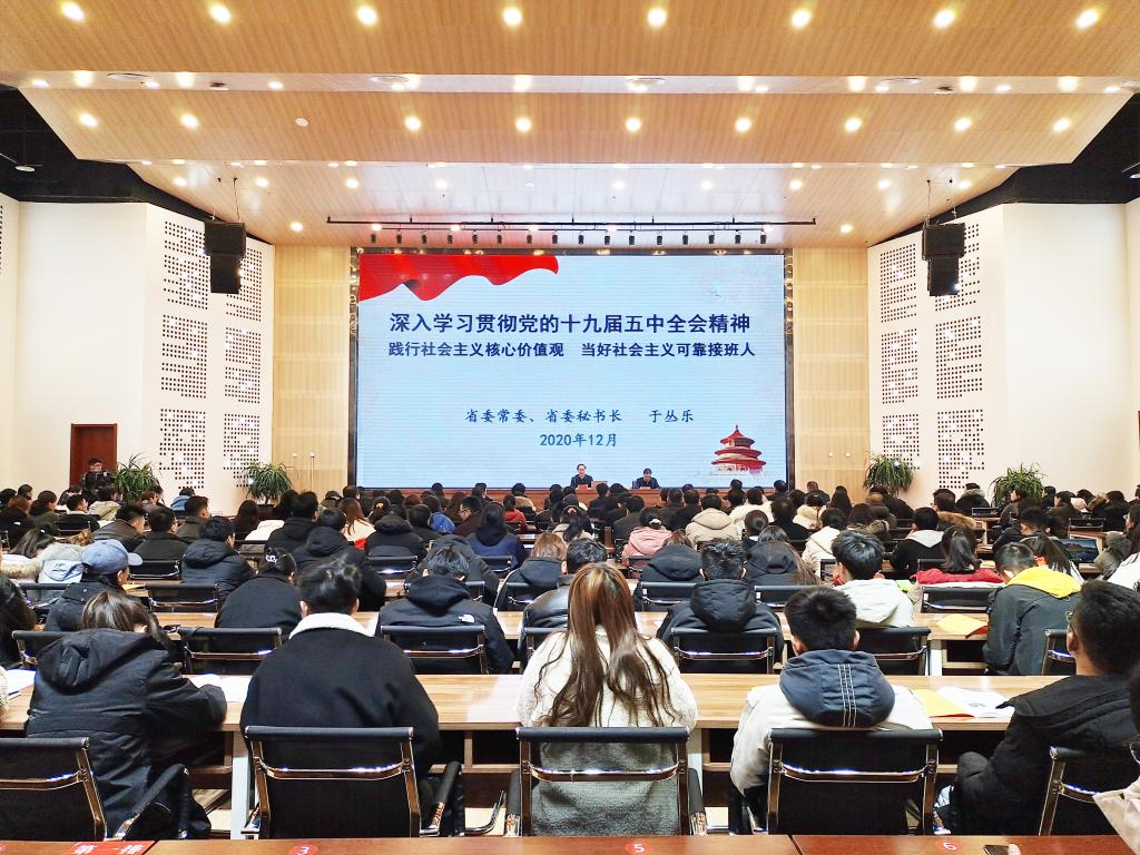 12月17日,省委常委、省委秘书长于丛乐来校为师生讲授了一堂生动的思政理论课。省委副秘书长徐信阁,省委宣传部副部长高波,省委教育工委秘书组组长、省教育厅厅长韩英,省委办公厅综合三处、省委常委办、省教育厅相关部门负责同志及校领导、各部门各学院相关负责人、思政课教师、学生代表200余人聆听思政课。校党委副书记、常务副校长马德明主持报告会。