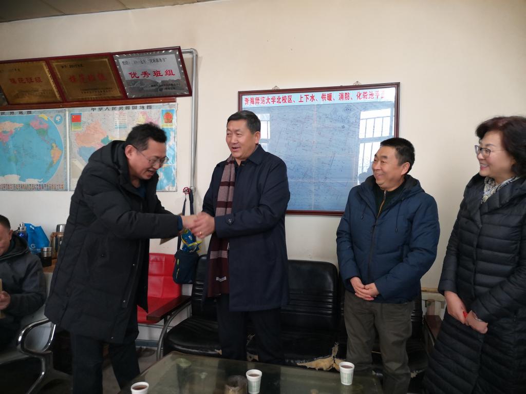 扎布一行与坚守在工作岗位上的各部门领导与职工亲切交谈,详细了解值班人员工作、生活情况,感谢他们的辛勤工作,向他们及家人表达新年的美好祝福。希望在岗人员继续坚守岗位,恪尽职守,确保寒假和春节期间各项后勤服务工作正常运转,切实维护校园安全稳定。同时还要求相关部门要为值班人员做好服务保障工作,让他们在岗也能过个快乐舒心的春节。