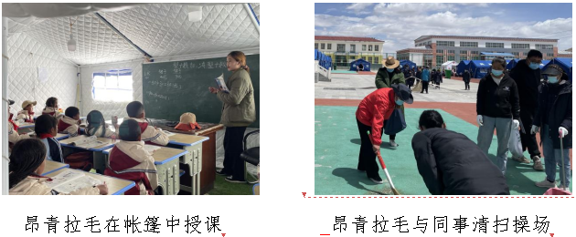 地震之后余震不断,为保证近百名学生及教师的生命安全及相应教学工作与生活不受到影响,昂青和其他28名老师彻夜未眠,和赶来的武警部队官兵共同搭建临时帐篷98顶,学生们平日的教学和生活住宿问题才暂时恢复了正常。在五月的天气里,震后花石峡镇的最高温度只有6℃,在如此恶劣的气候条件下,昂青和她的同事们和往常一样坚守在自己的岗位上。安抚每一位学生的的情绪,尽心照顾每一个学生,教学任务更是没有落下。