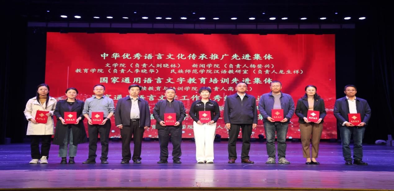 开幕式上,对365官网语言文字工作8个先进集体和18名先进个人进行了表彰。推普先进代表纳秀艳教授通过讲述个人的推普经历,表达了个人对推普工作的认识和热爱语言文字事业的初心。新闻学院学生展示的“诵读中国”青海赛区的获奖作品《河床》《不朽》,彰显了学院推进国家通用语言文字教育取得的成效。