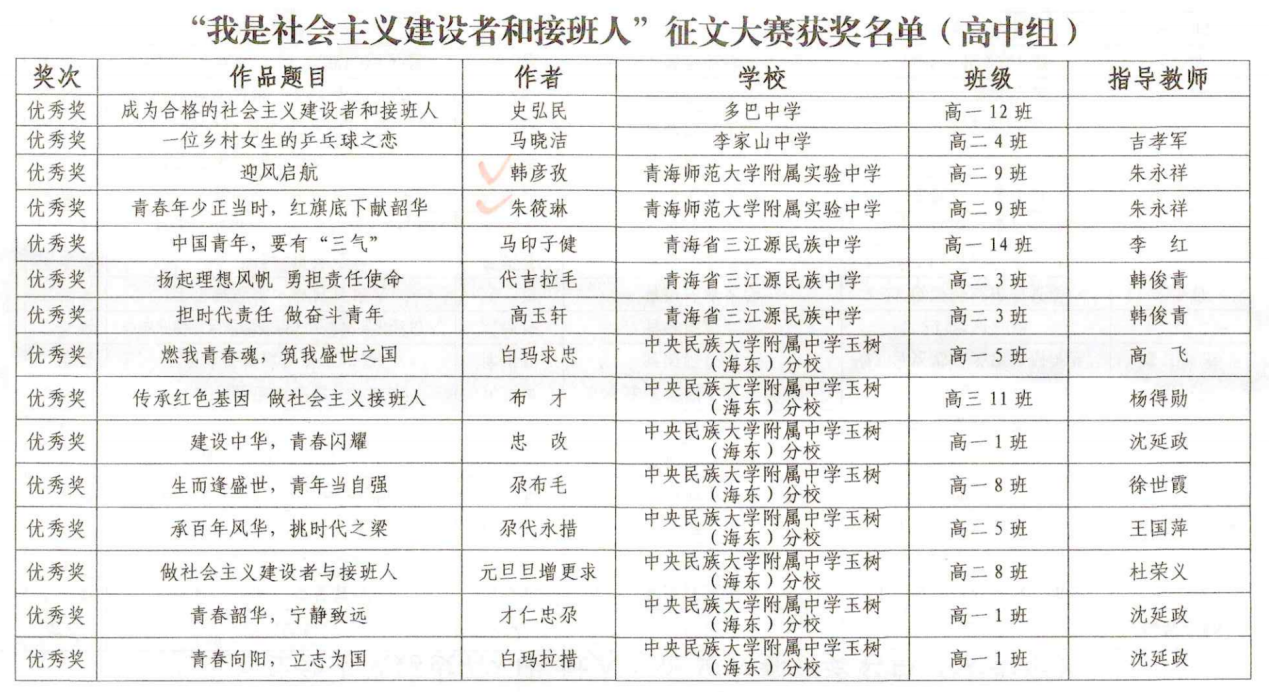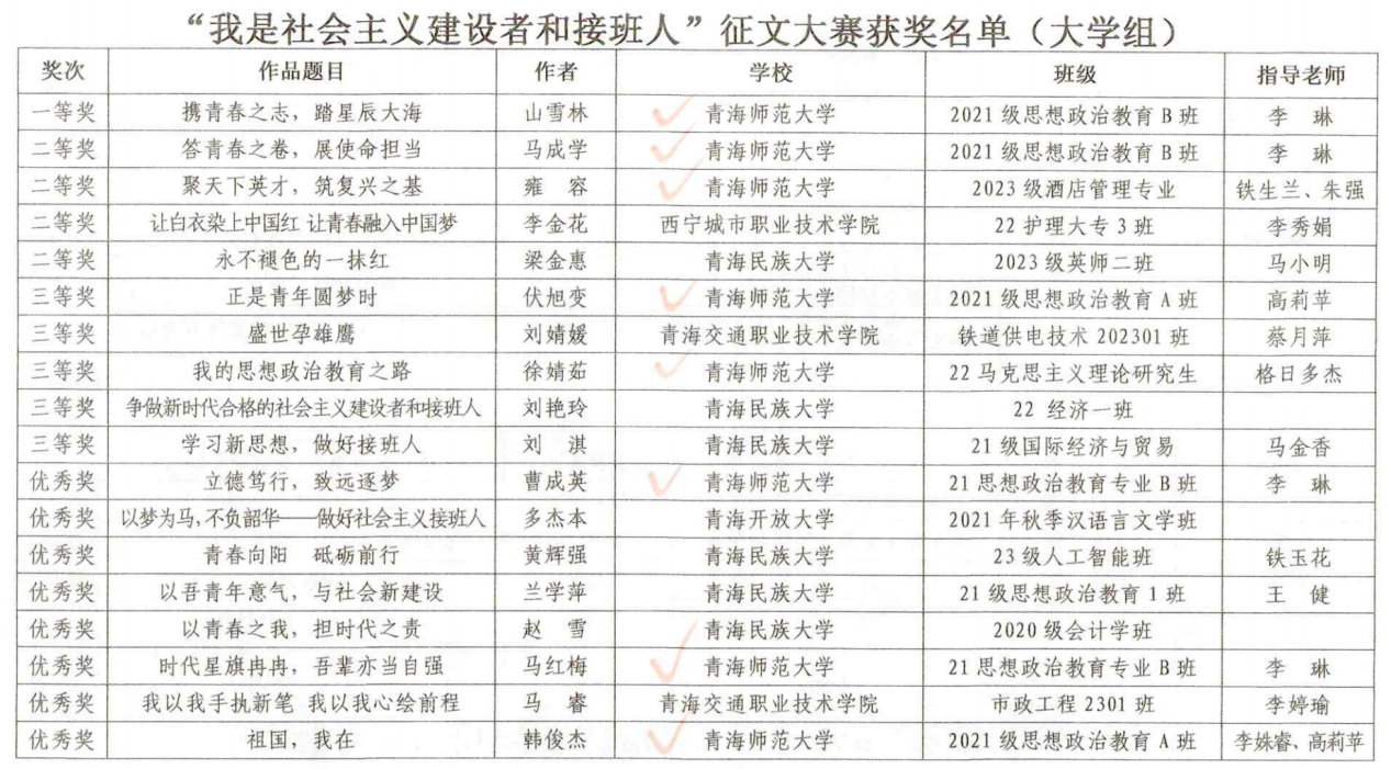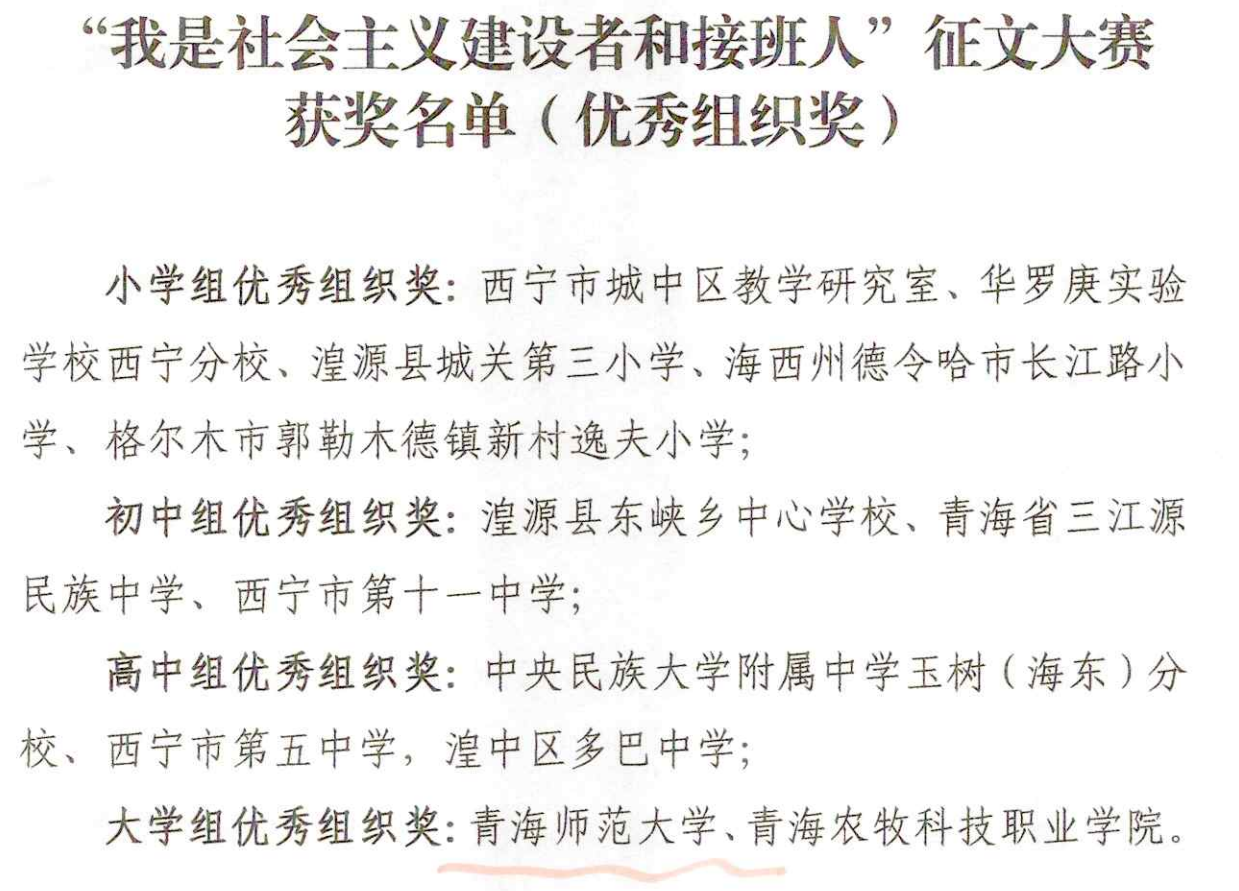 12月25日,由青海省教育厅、西海都市报社联合举办的“我是社会主义建设者和接班人”全省大中小学生征文大赛结果公布。大赛共收到来稿3997篇,其中小学组1932篇,初中组856篇,高中组837篇,大学组372篇。经过严格评审,365英国上市公司官网及其附属实验中学共有10名同学获得大赛个人奖项,365英国上市公司官网荣获大学组优秀组织奖。