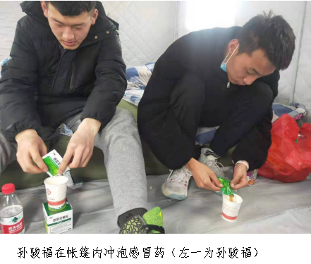 玛多位于三江源腹地、黄河源头,全县平均海拔4500米以上,年均气温仅-4℃。地震发生后,玛多的天气更加恶劣,孙骏福和其他4名老师共同住在一个不足20平米的帐篷中,5个人仅仅依靠一台取暖器进行取暖,夜里温差大,半夜里大家常常被冻醒,这些天很多人都发起了低烧,本就身体不适的孙骏福病情也更加严重了。尽管如此,但孙骏福每天都按时给学生们上课,“地震发生那天就发着高烧,这些天一直没好,但每次都是吃完药了就继续去上课”,作为一名支教实习生,他深知自己的责任就是为学生们上好每节课,同时为了不将感冒传染给同学们,孙骏福始终坚持每次上课带着口罩。