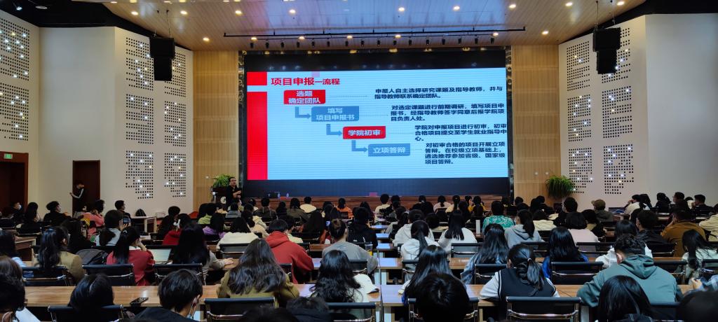 培训会上,王甲泰老师结合学校人才培养目标和培养方案要求,阐释了开展创新创业项目的重要意义,强调了创新创业项目对个人综合测评、求学深造及就业的重大影响,并从实践调查与学术研究分类入手,就项目选题进行了说明,鼓励同学们着眼前沿、积极实践,在项目开展中展现专业与综合素质。随后,王老师从“做什么、为什么做、如何做”三个角度对双创项目的开展进行了详细解读。最后,就同学们对创新创业项目相关事宜存在的问题进行了现场答疑与解惑。