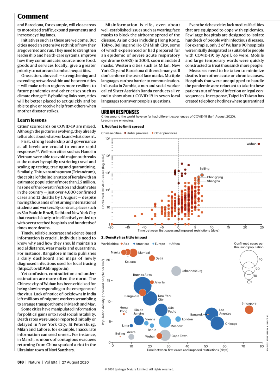 该文包括全球应对新冠肺炎(COVID-19)疫情的经验与教训(Learn Lessons),城市确诊病例数与其人口密度的关系(Bust myths)、发挥城市网络系统的功能(Mobilize networks)、增强城市网络化功能韧性(Build resilience)等4个部分。研究结果表明城市网络化功能韧性在疫情管控中发挥了关键作用,让人们通过构建与完善城市协同网络,共享综合减灾与风险防范规划,加强巨灾应急能力。
