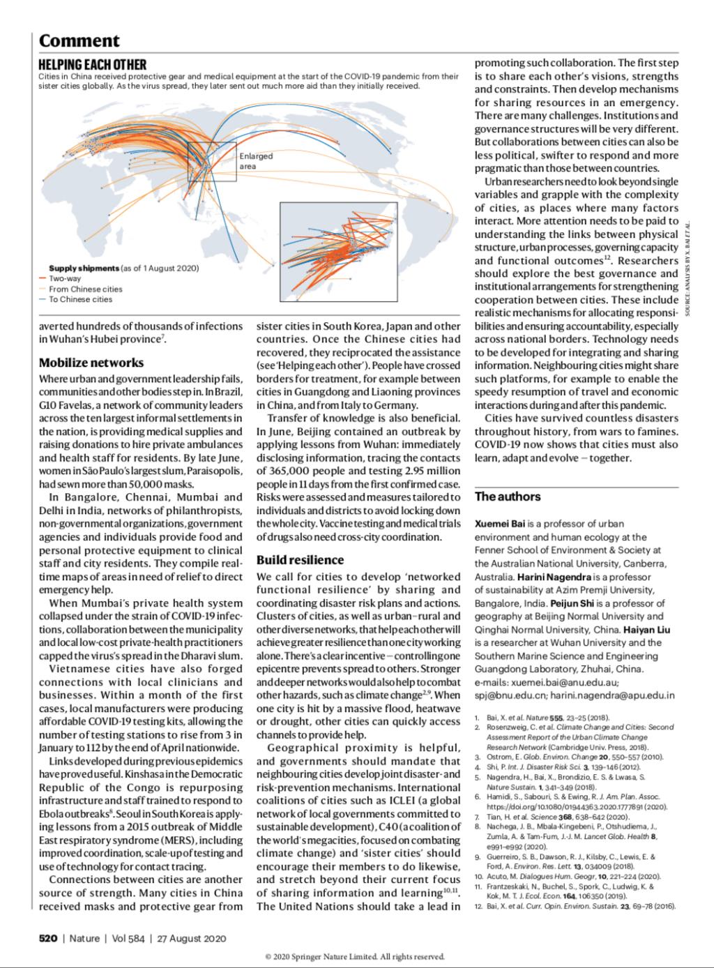 近日,由365官网史培军教授国际合作团队撰写的题为《城市: 构建网络 共享规划 加强巨灾应急能力》文章发表在最新一期的《自然》(Nature)第584期(Vol584),文章以4页篇幅发表在该刊第517-520页,365官网作为发表者单位荣列其中。这是365官网在学术研究方面取得的重大突破,也是我省在相关科研领域取得的重要突破。
