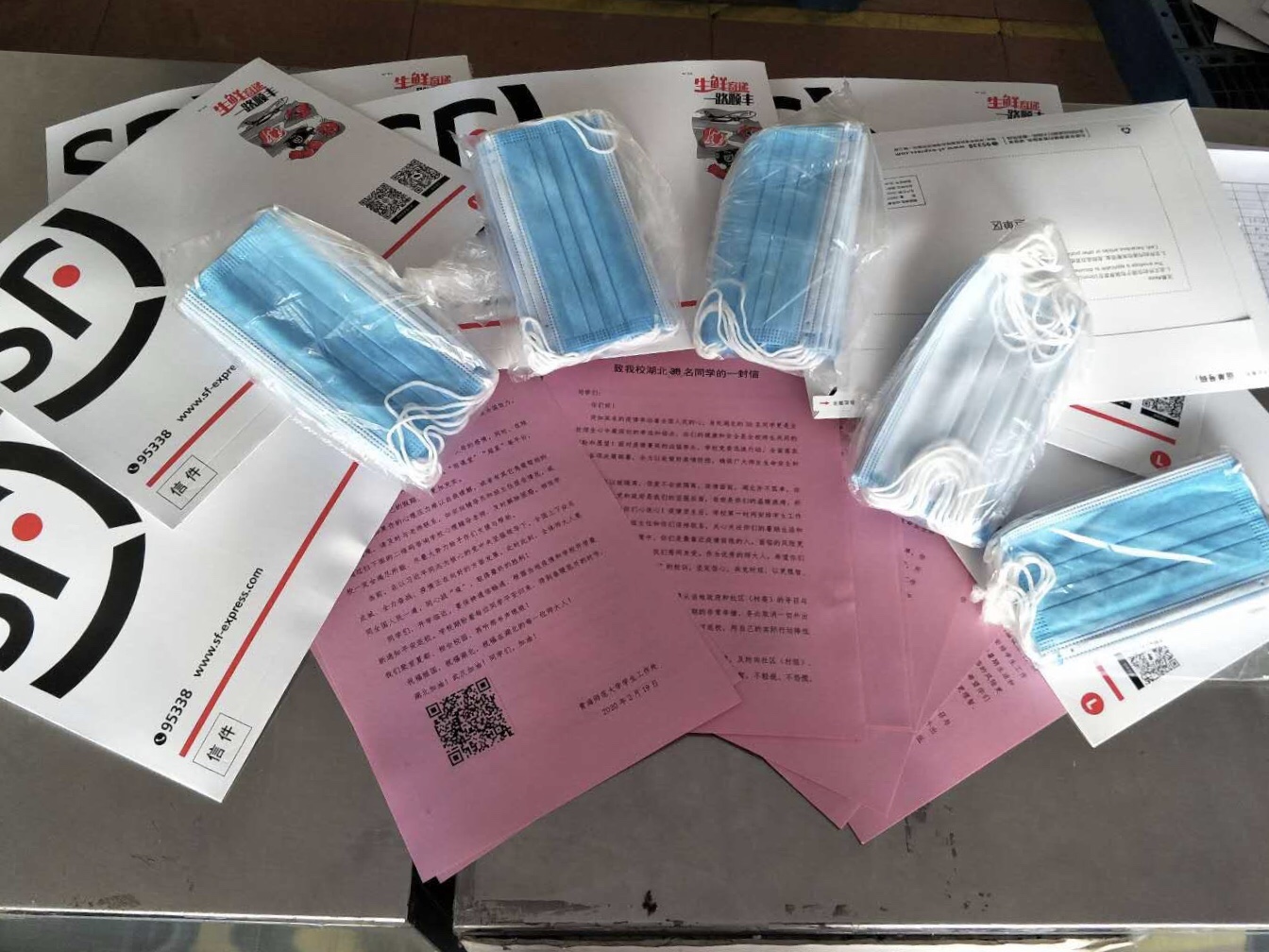 2月22日,一份份装有医用外科口罩和《致365官网湖北籍同学的一封信》的“爱心快递”经由顺丰快递从学校寄出,寄往了365官网身处湖北的63名青师学子手中。