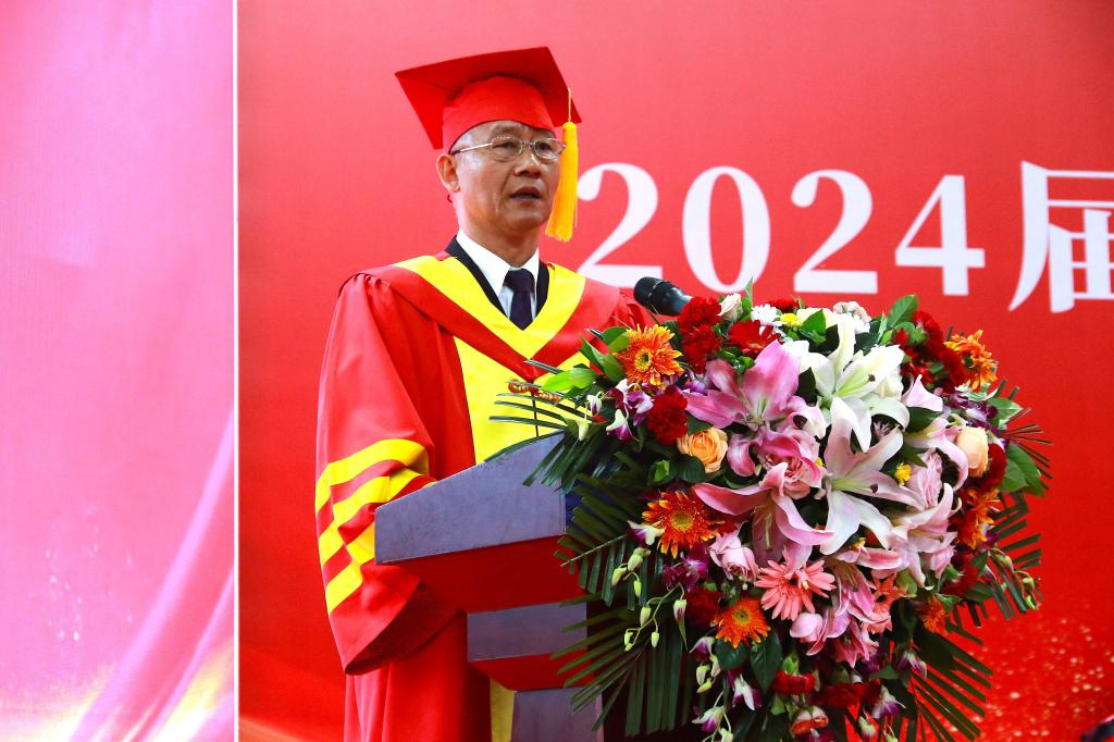 涂清云在讲话中代表学校向各位毕业生表示热烈的祝贺和美好的祝愿,向所有为学生成长付出辛劳、默默奉献的老师和家长致以衷心的感谢和崇高的敬意。他殷切寄语2024届毕业生,要坚守梦想,志存高远,成为敢于有梦、勤于圆梦的有志青年。要勤学修德,终生学习,成为求知善读、贵耳重目的有才青年。要知行合一,笃定前行,成为躬身实践、崇尚实干的有为青年。勉励同学们要牢记习近平总书记对青年人的嘱托,争做有理想、敢担当、能吃苦、肯奋斗的新时代好青年,在推进强国建设、民族复兴伟业中展现青春作为、书写青春篇章。