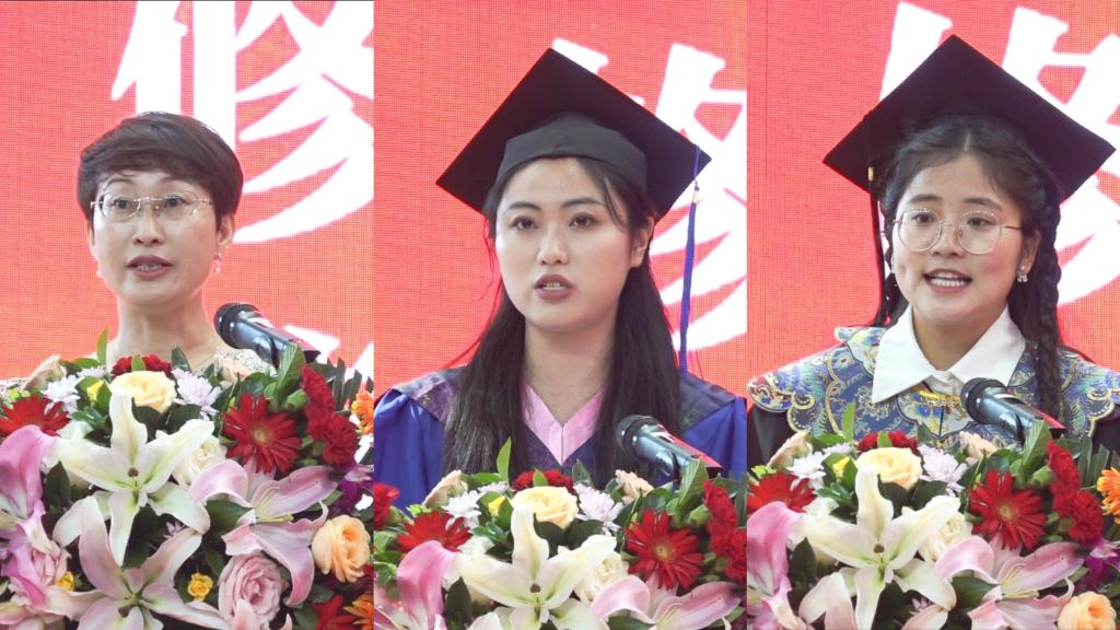 导师代表、教育学院副教授马文娟在发言中鼓励毕业生不忘初心,继续逐梦前行。优秀毕业研究生代表、美术学院智绪璇,优秀毕业本科生代表、法学与社会学学院胡可心分别发言,毕业学子们在发言中深情回顾自己在学校的成长与收获,表达了对母校和老师的深切感恩和依依眷恋。