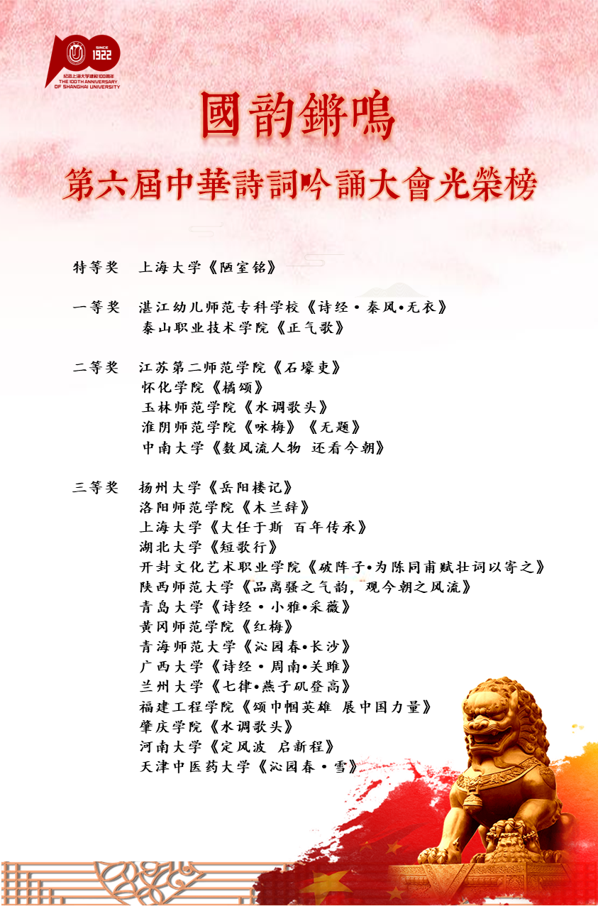 为了弘扬中华优秀传统文化,传承红色基因,激发当代大学生对诗词的学习兴趣,彰显中华诗词的当代价值,为党的二十大献礼,上海大学承办了以“传承红色基因,吟咏时代精神”为主题的“第六届中华诗词吟诵大会”。本次大会由中华诗词学会、中国韵文学会指导;由中华诗词学会现当代诗词研究工作委员会、中华诗词学会高校诗词工作委员会协办。此次大会收集到来自全国各地36所大专院校的101件作品。