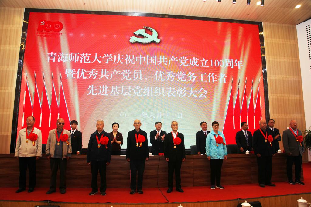 一是在全校“两优一先”表彰大会上颁发。为充分体现党中央对老党员的关怀,在学校召开的庆祝中国共产党成立100周年暨优秀共产党员、优秀党务工作者、先进基层党组织表彰大会上,校领导向8名50年以上党龄的老党员代表颁发了“光荣在党50年”纪念章,发放了慰问金,全体党员起立集体向老党员致以崇高敬意。