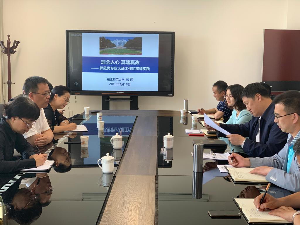 7月10日下午,东北师范大学教务处处长魏民教授一行4人应邀莅临学校指导师范类专业认证工作并召开座谈会。教务处、基础教育处相关负责人和各学院院长、师范专业负责人、卓越教师项目负责人、三所附属中学的校长参加了会议。会议由副校长冶成福主持。