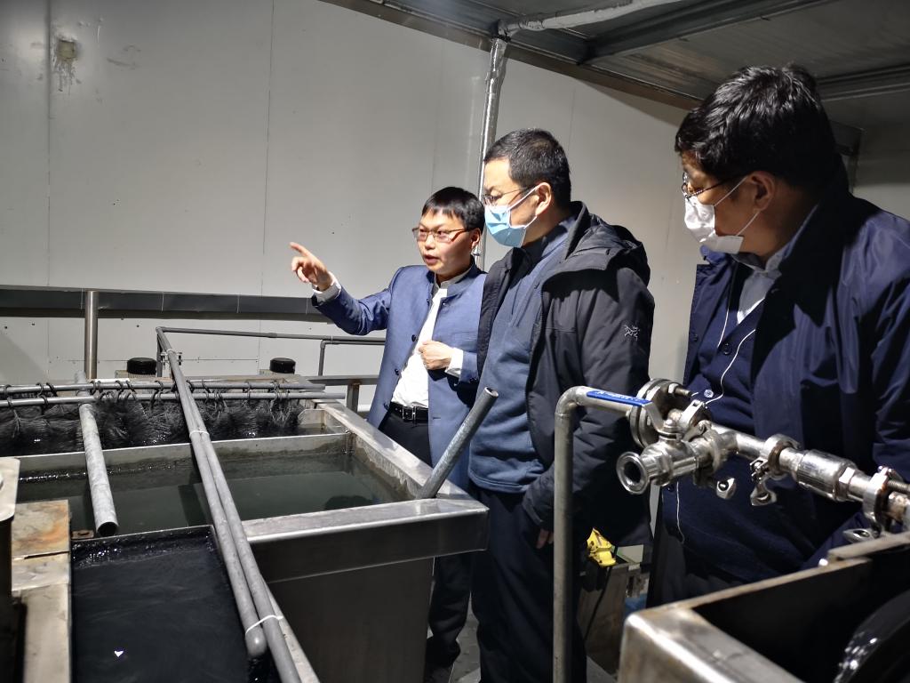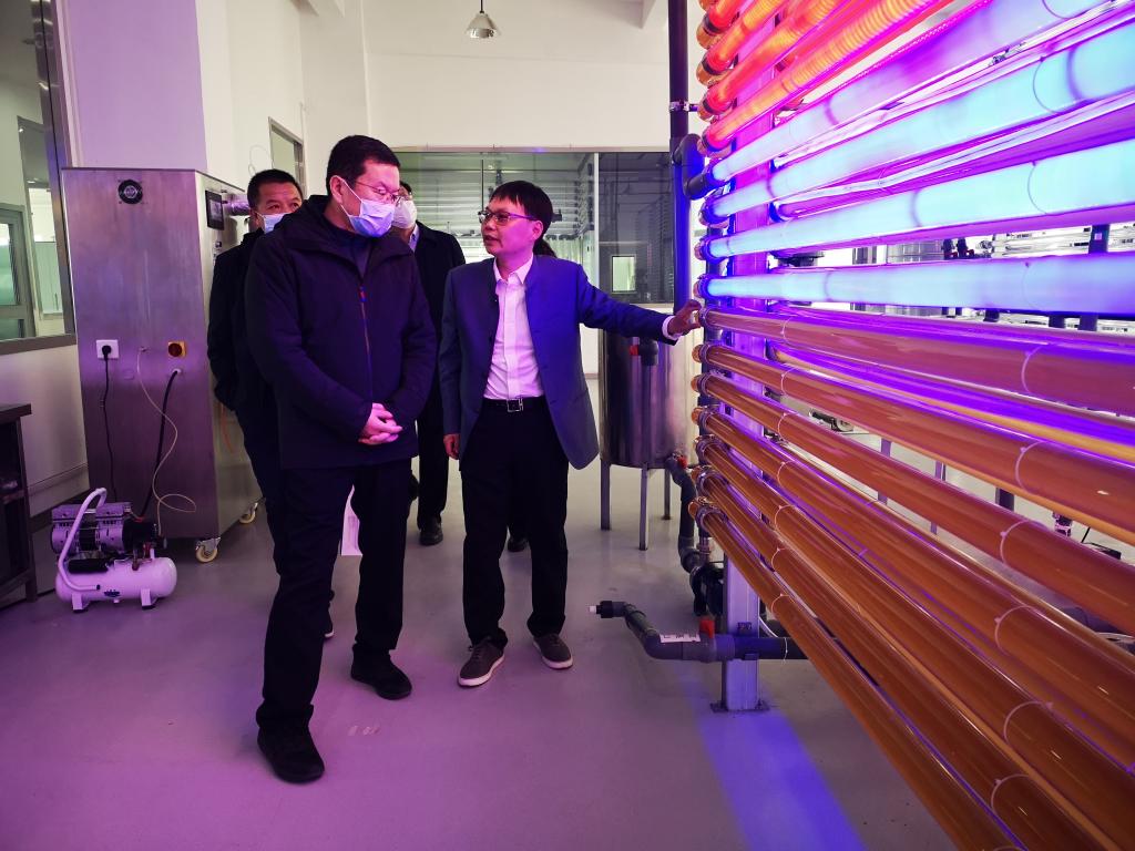 毛学荣一行先后参观了“高原微藻研究与应用项目”的微藻共生体系养殖车间、高原微藻种质资源库、微藻一级扩培间、微藻中试间、微藻检测中心等,详细了解了高原微藻的选种育种、生长培养、制成生产以及藻类与水生物共生、生物废料、养殖用水的循环利用情况。听取了“高原微藻研究与应用项目”在基础研究、重点任务和技术方案、预期产出、成果转化等方面的专题汇报。