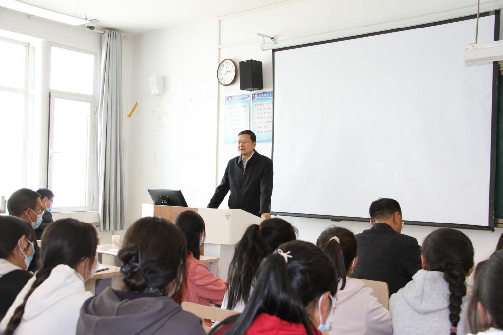 3月23日下午,校党委书记毛学荣走进民族师范学院为2021级藏语言文学专业、文秘专业134名同学讲授思政课。