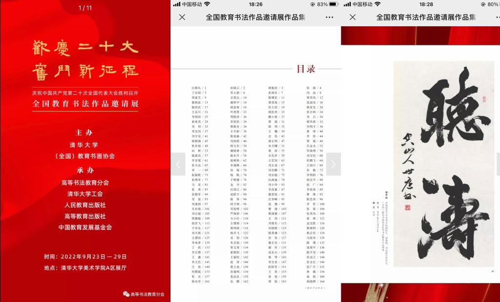 9月23日,由(全国)教育书画协会、清华大学主办,(全国)教育书画协会高等书法教育分会、清华大学工会、清华大学美术学院承办,人民教育出版社、高等教育出版社、中国教育发展基会协办的“欢庆二十大 奋斗新征程——全国教育书法作品邀请展”在清华大学美术学院正式开幕。365官网美术学院副院长都世庭的书法作品被邀请参加。