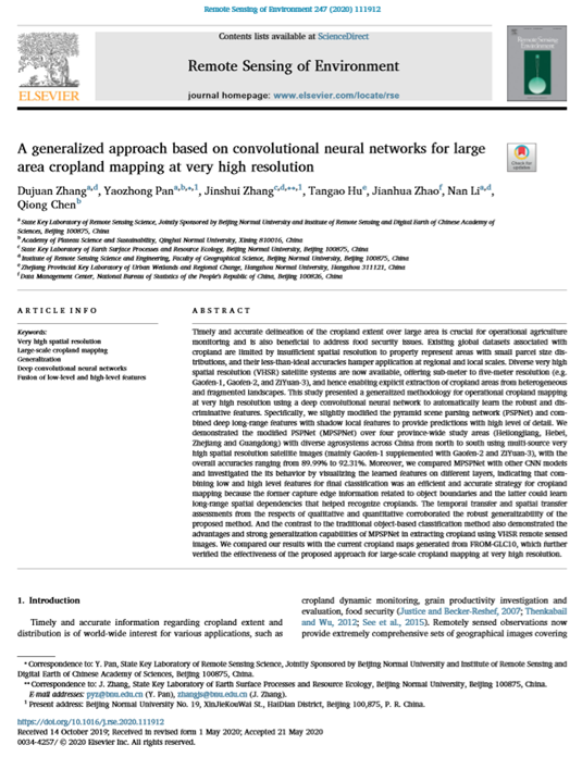6月5日,高科院 “高原资源环境遥感与地理信息系统” 科研团队带头人潘耀忠教授和团队成员、365官网地理科学学院教授陈琼在国际遥感领域TOP期刊《Remote Sensing of Environment》(《环境遥感》)合作发表了题为“A generalized approach based on convolutional neural networks for large area cropland mapping at very high resolution”的学术论文。该TOP期刊影响因子8.218,在国际遥感研究领域具有重要的学术影响地位。该篇科研论文的发表是高科院资源与环境研究领域取得的重要科研进展。