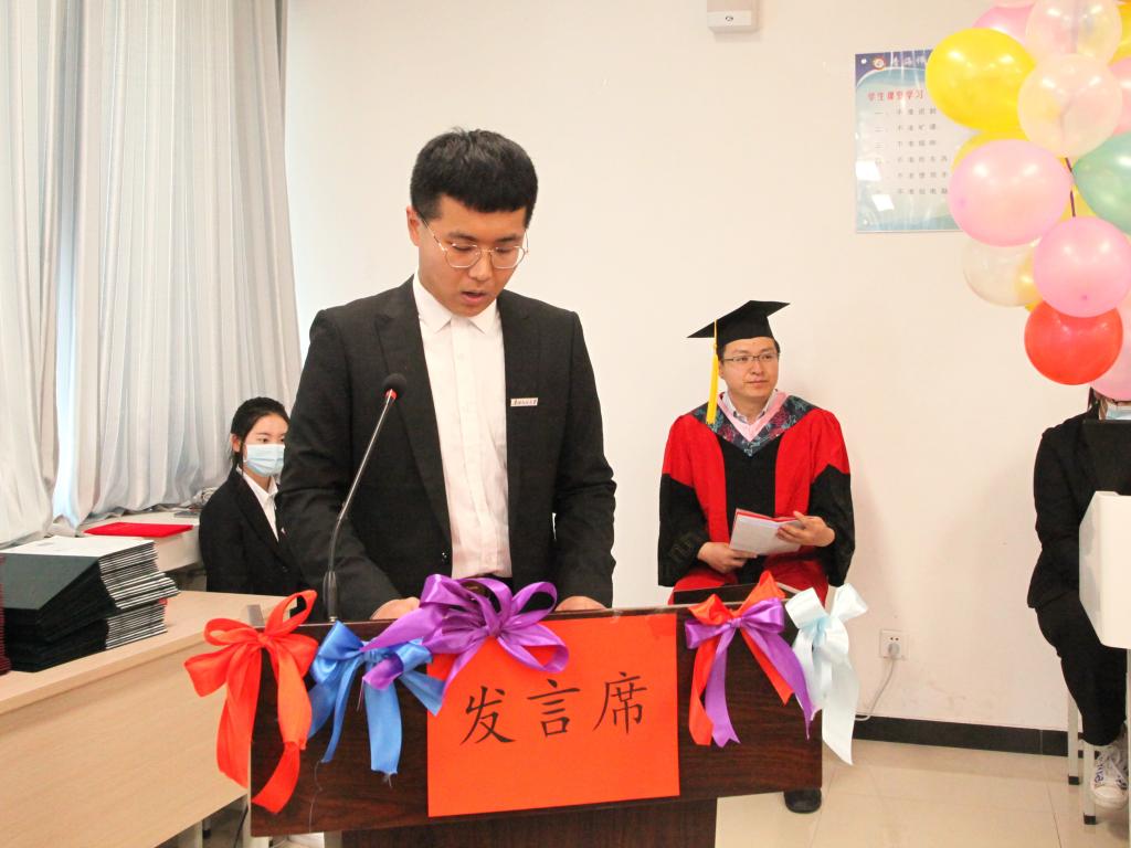 优秀在校本科生代表王兴宇同学代表学院全体在校生对即将离开母校的师兄师姐们表达了最衷心的祝愿,对师兄师姐们一直以来的关心、支持和帮助表达了最诚挚的感谢。