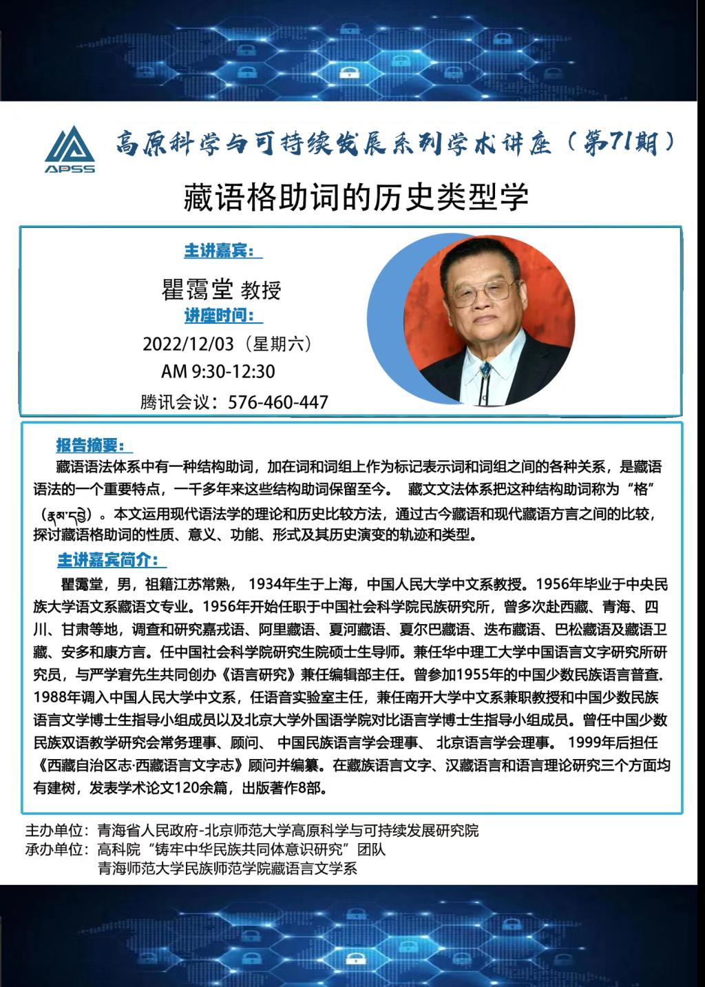 为进一步增进校内外学术交流,拓展师生学术研究视野,促进学校科研创新氛围,我院定于2022年12月3日(星期六)在线举办第71期高原科学与可持续发展系列学术讲座,欢迎届时参加交流。
