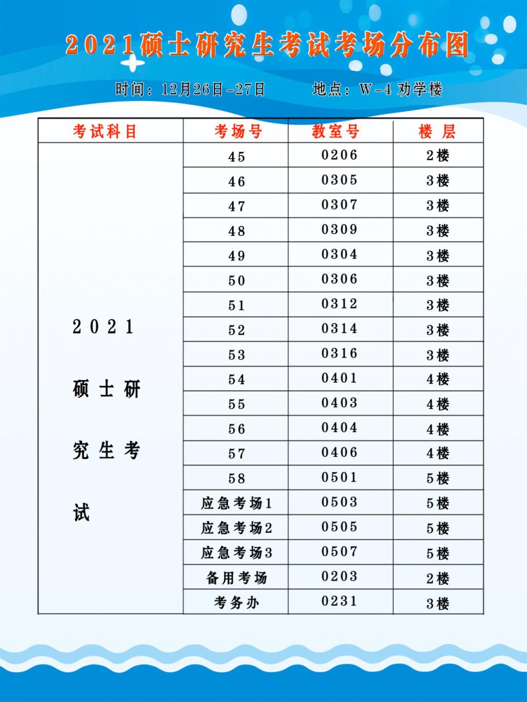 欢迎各位考生参加全国2021年硕士研究生招生考试,现将6304考点考场具体位置公布如下,请考生按照准考证考场序号对应考场位置,并根据考场布局图,按照时间要求提前查看考场位置,合理安排出行时间,以免影响正常考试,学校在12月26日、27日在学生食堂给各位考生预备午餐,可以使用微信和现金支付(建议使用现金支付)。最后预祝所有考生考试成功。
