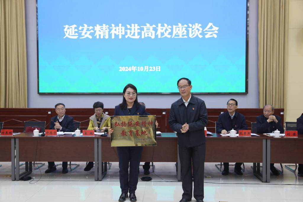 会上,青海省延安精神研究会秘书长付东明为365官网授予“弘扬延安精神教育基地”牌匾。