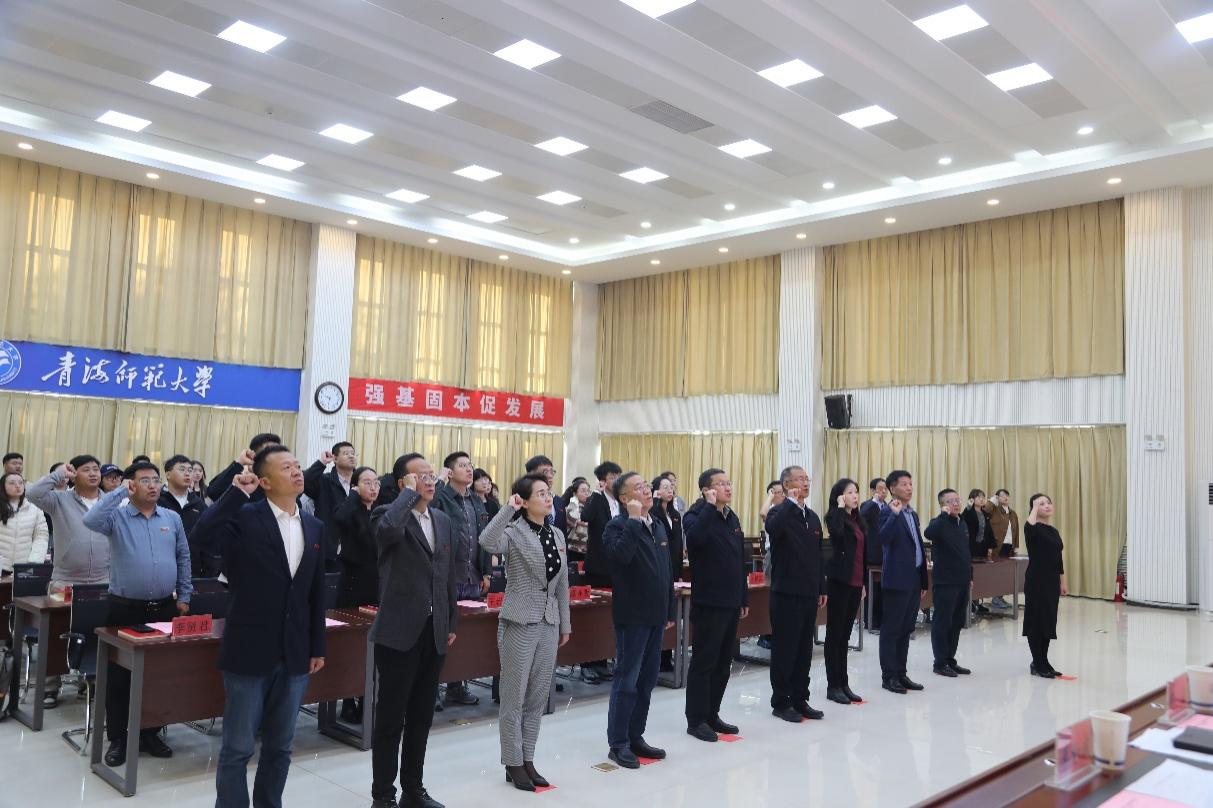 开班仪式上,与会领导为新入职教师代表佩戴了校徽,全体新入职教师面向国旗,庄严宣誓。掷地有声的誓词,是每一位新教师的自我期许,更是对教育事业的庄严承诺。